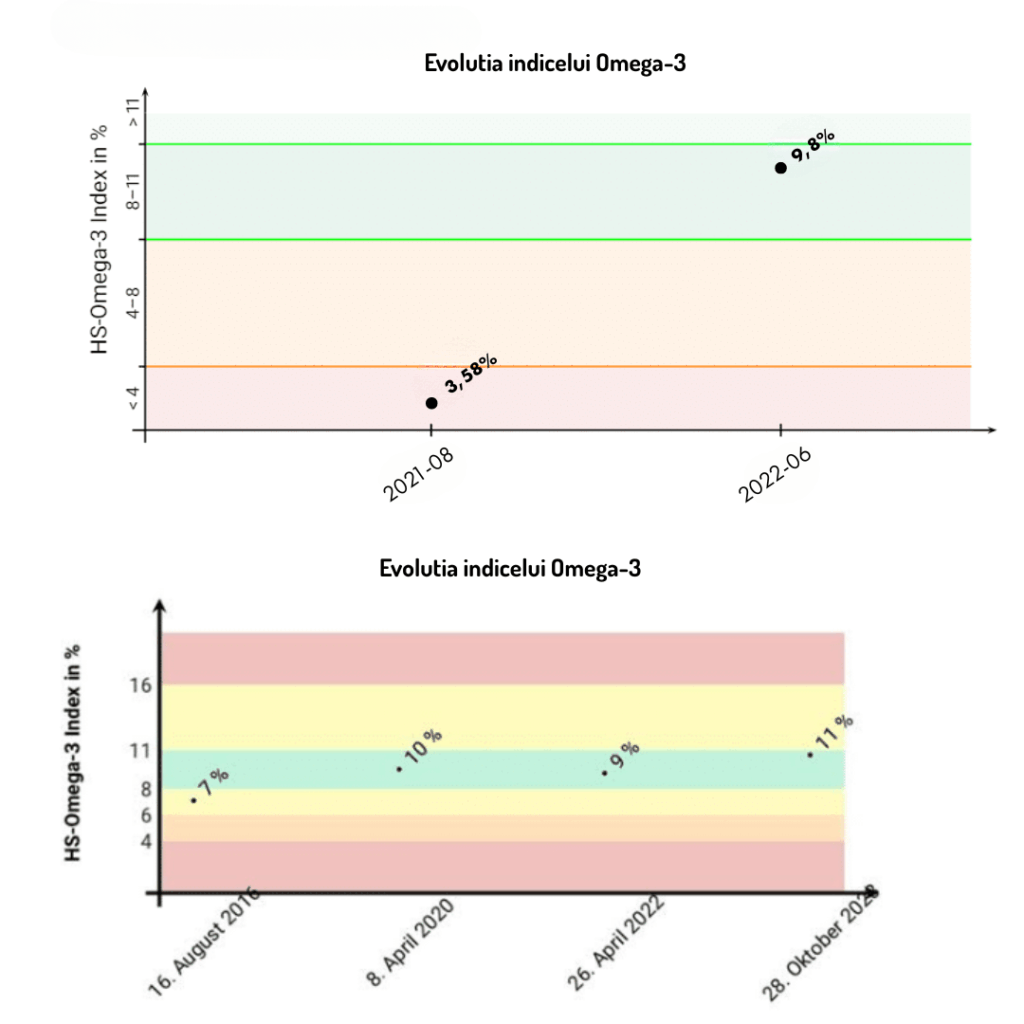 – 2023: Indicele Omega-3 a crescut în continuare la 11%, demonstrând că un aport continuu și o dietă adaptată pot avea un impact pozitiv pe termen lung asupra indicelui.