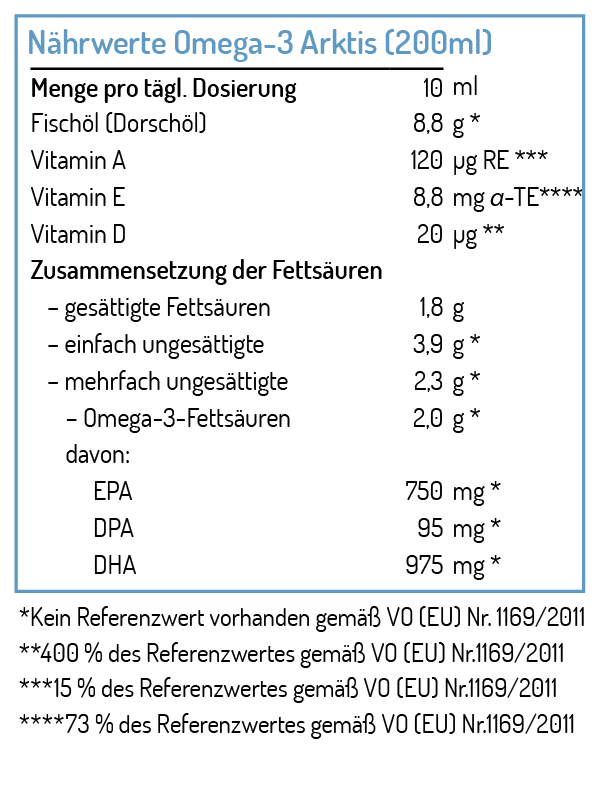 O doză zilnică (10 ml – o lingură) oferă 2.000 mg de acizi grași omega 3, cu un conținut ridicat de DHA și EPA, doi acizi grași esențiali cu beneficii demonstrate pentru inimă, creier și vedere.